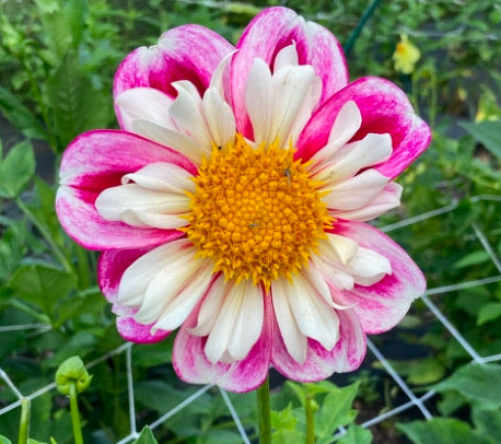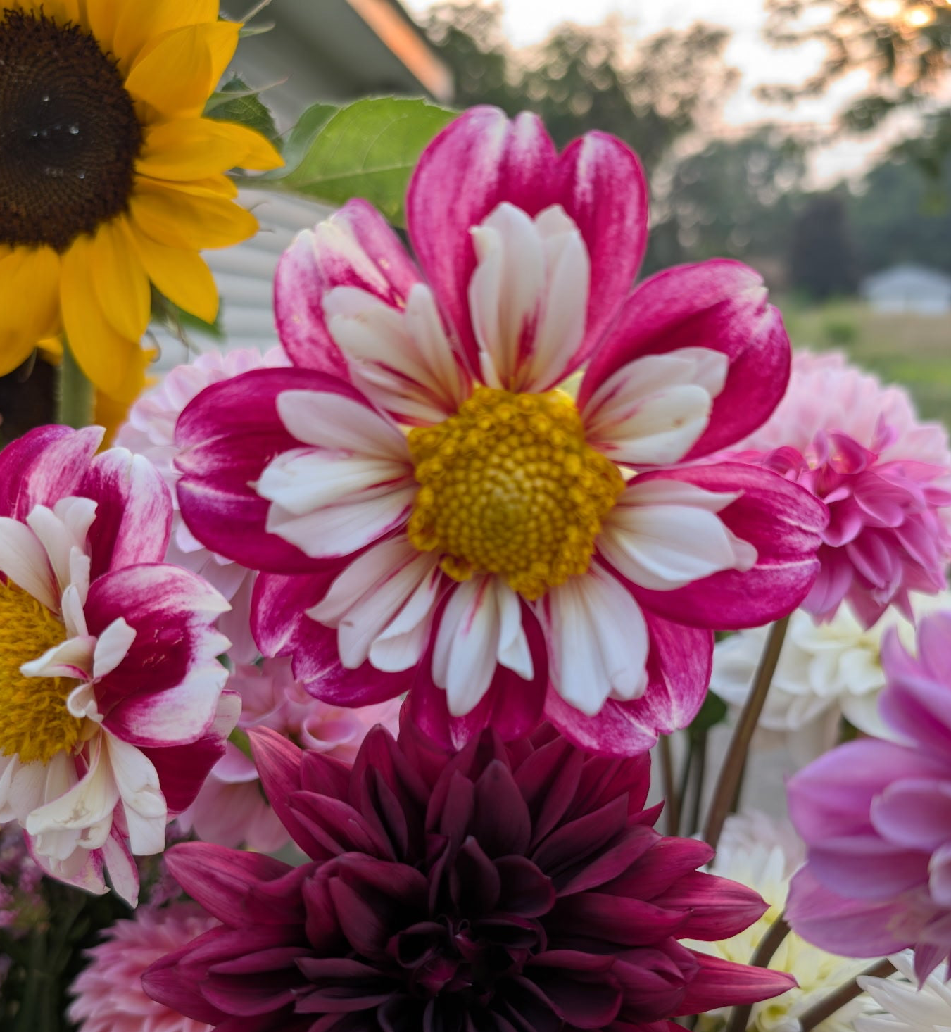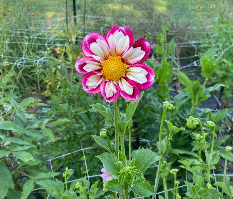 One of our favorite collarette's. White blooms with sunny yellow centers and berry-tipped petals create a playful, high-contrast look. Strong stems and great productivity make it a reliable cut flower.