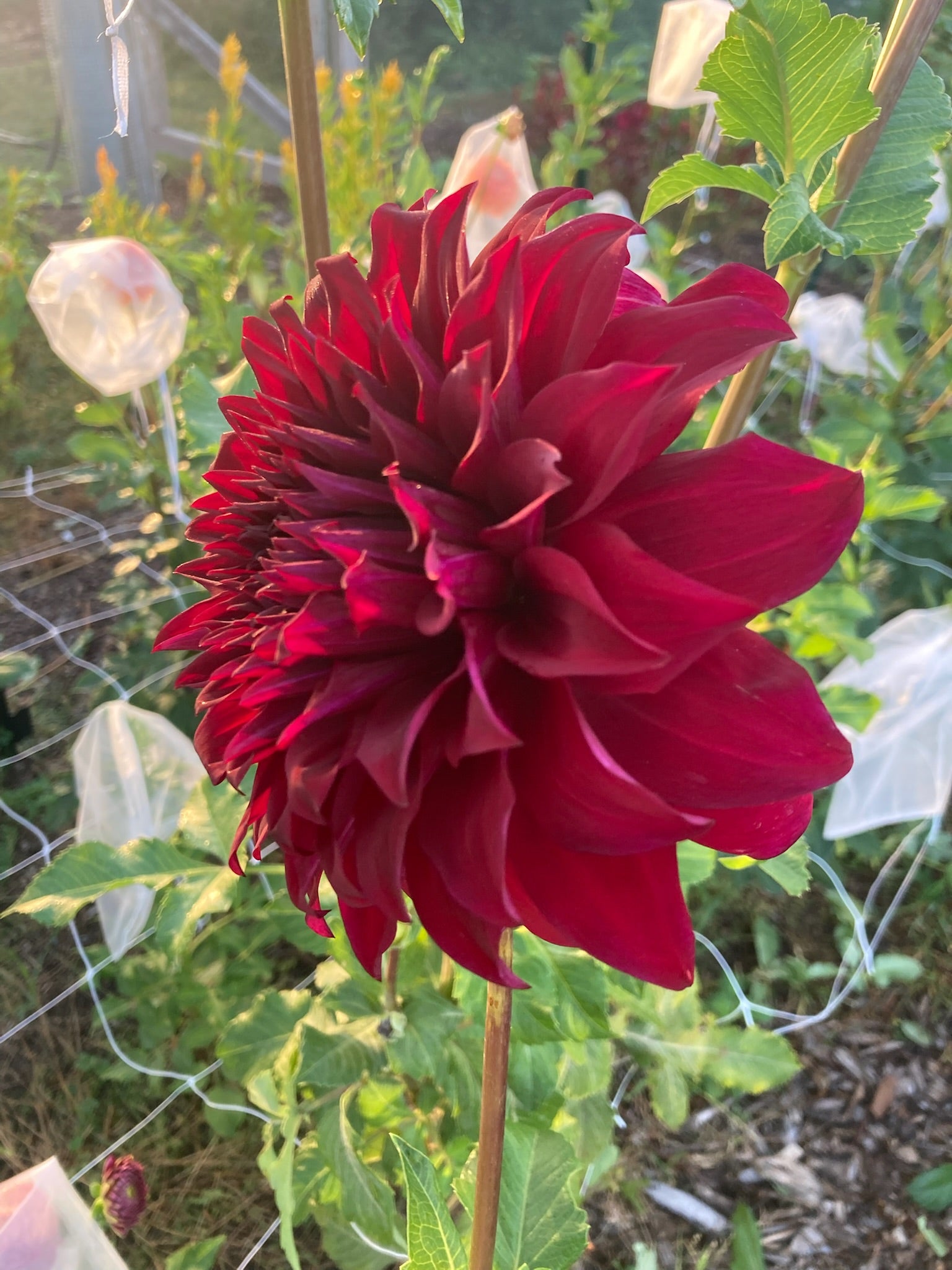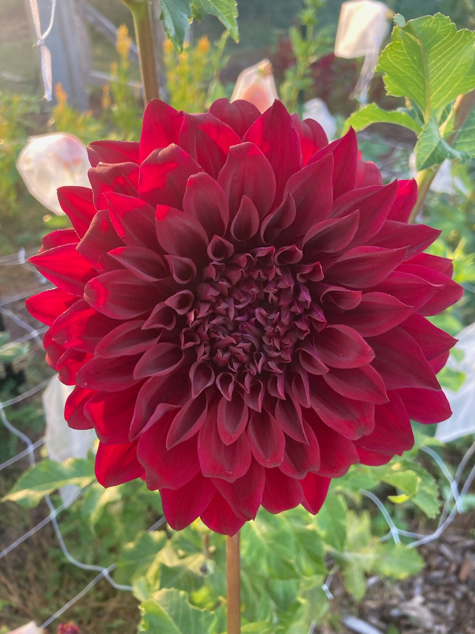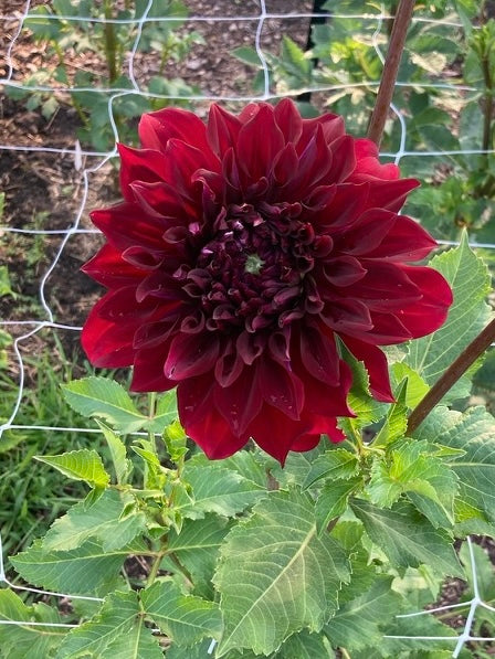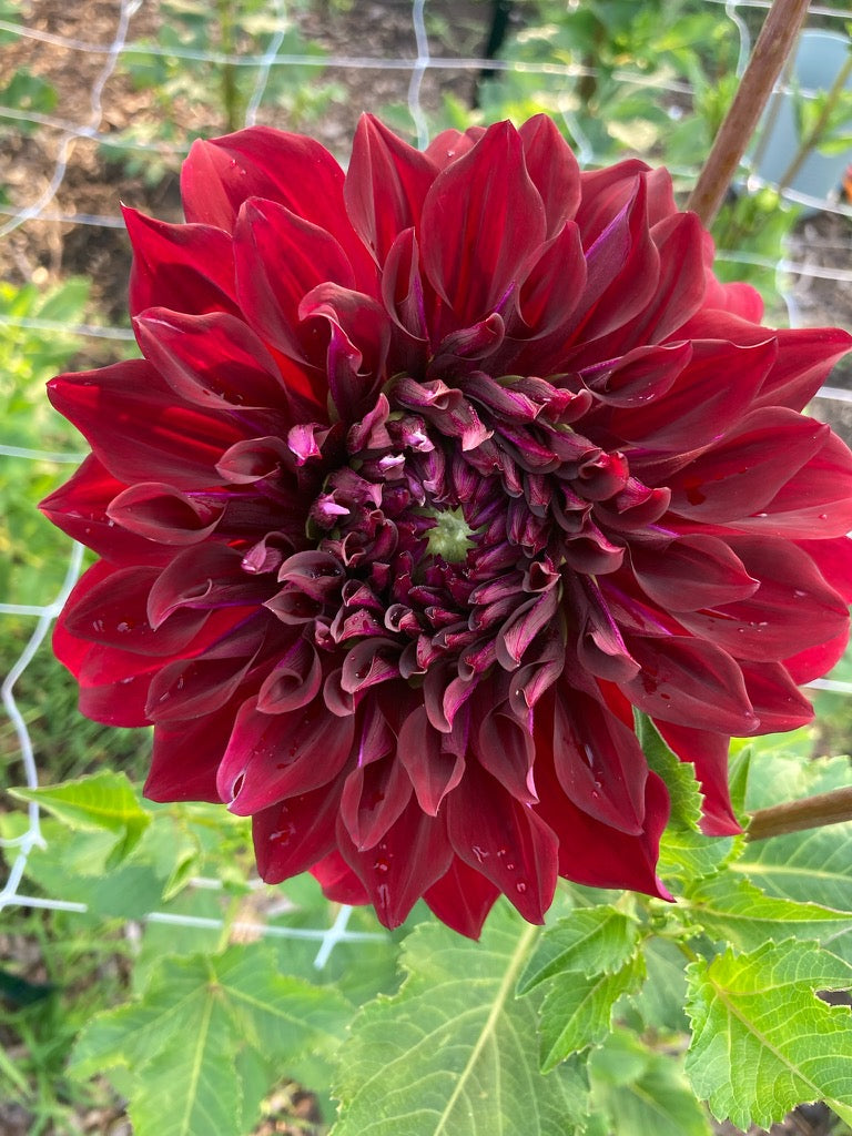 The Spartacus dahlia is a dramatic dinner-plate variety with velvety, deep crimson to black-red blooms, fully double petals, and an elegant orb-like form created by gracefully recurved petals. An informal decorative type with strong stems, it delivers rich color and exhibition-worthy impact from midsummer through frost.